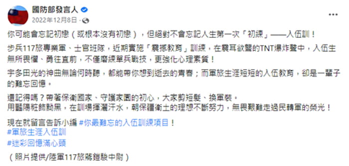 服兵役是男生一生中極為重要的里程碑,不僅是盡到國民義務,更是一段特別的經驗。國防部以同音字「初練」在臉書幽默詼諧發文,你可能忘記曾經的初戀,但怎會忘記初入兵營,日日痛苦操練的入訓生活,再搭配油膩膩的餐盤與地獄伙食,讓人想遺忘都很困難!