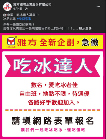 雅方推出職缺「冰品試吃員」以此核心操作社群議題,並透過新聞、口碑、精準廣告等方式觸及潛在購買族群,引發討論並造成線下購買。